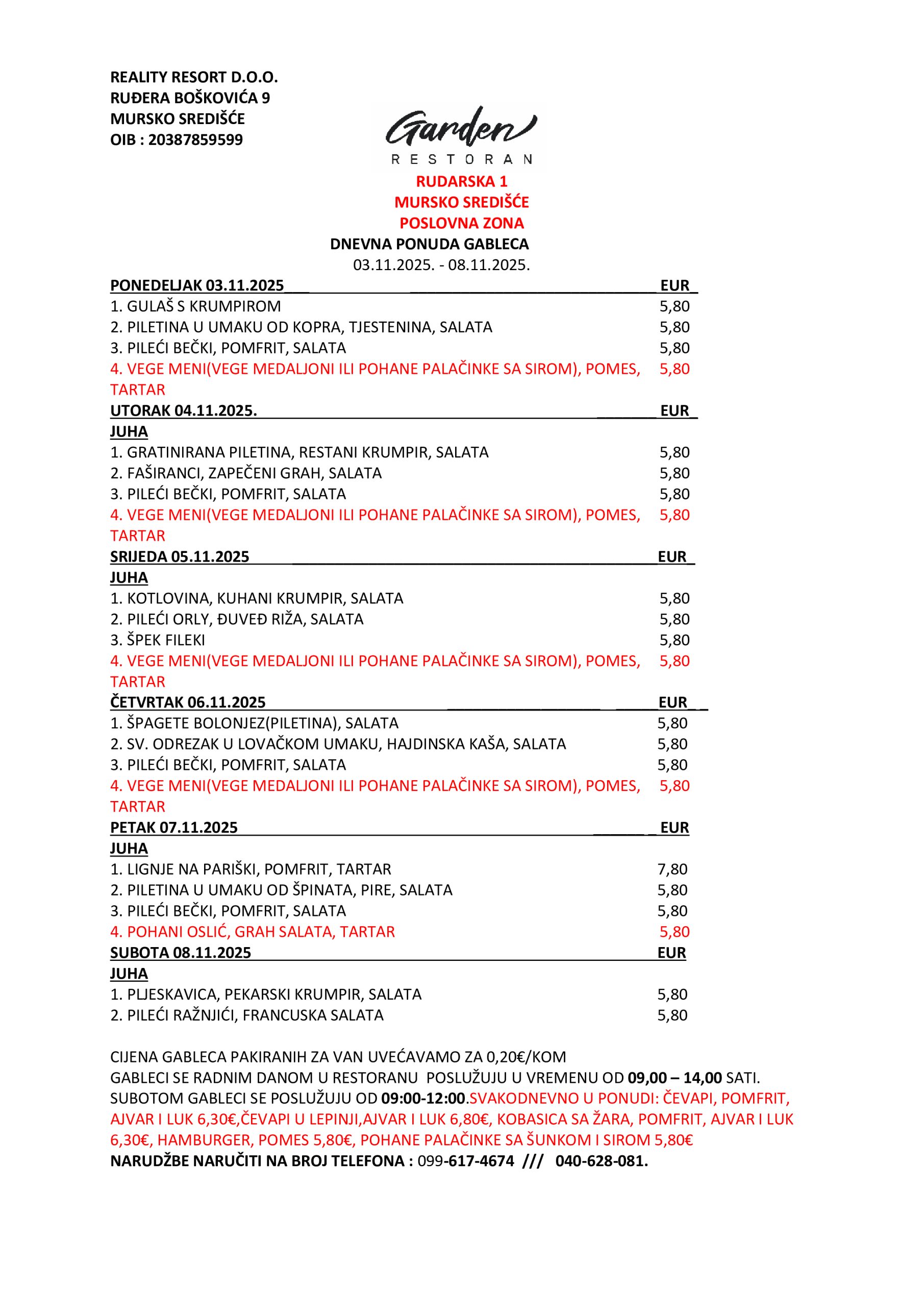 Garden, u centru industrijske zone na adresi Rudarska 1, Mursko Središće, postaje oaza okusa, pružajući fini i kvalitetan ručak. Od 9:00 do 14:00 sati, nudimo posebno osmišljene gablece – inspirirana toplinom domaće kuhinje. Tri raznolika menija svakodnevno su pripremljena s pažnjom i strašću naših kuhara, nudeći svježinu sastojaka kao ključni sastojak svakog jela.